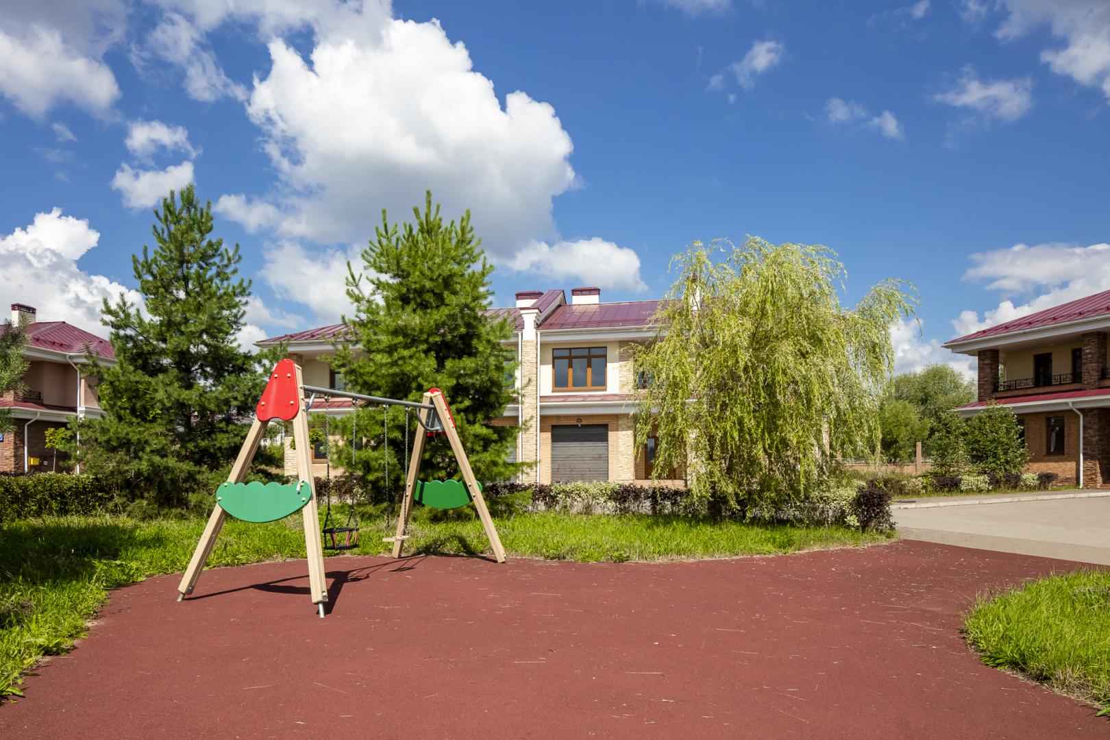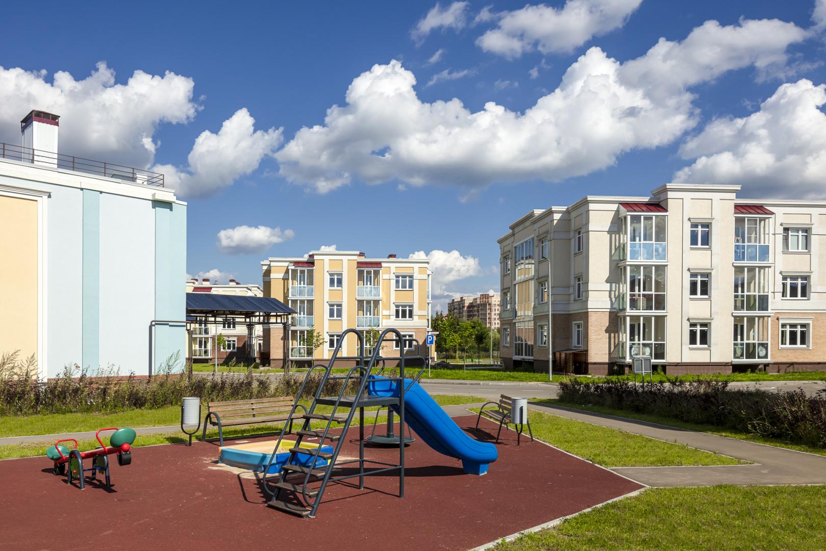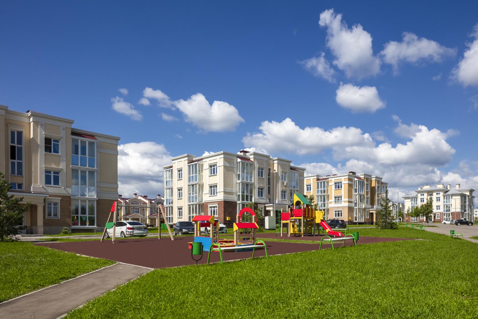 Территория комплекса полностью благоустроена — организованы детские и спортивные площадки, высажены деревья, кустарники и газоны, разбиты клумбы.