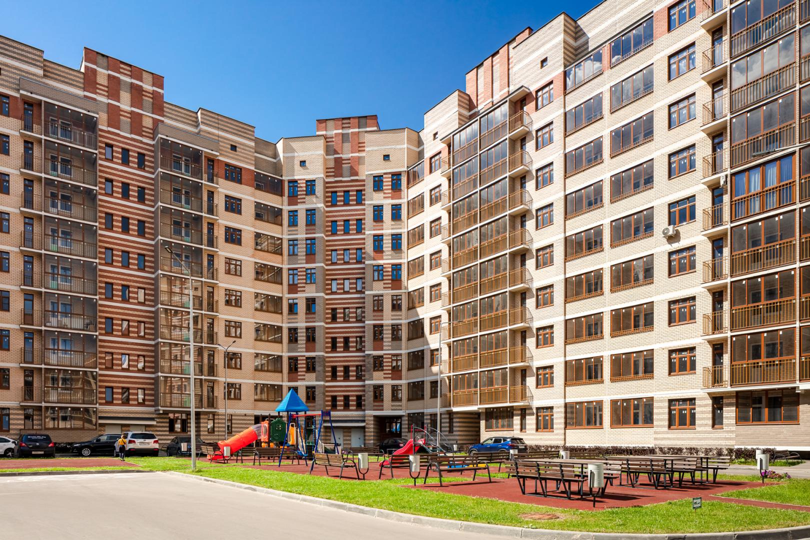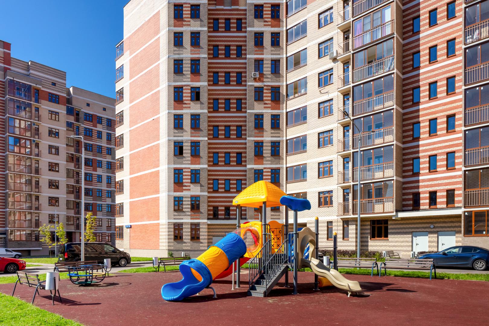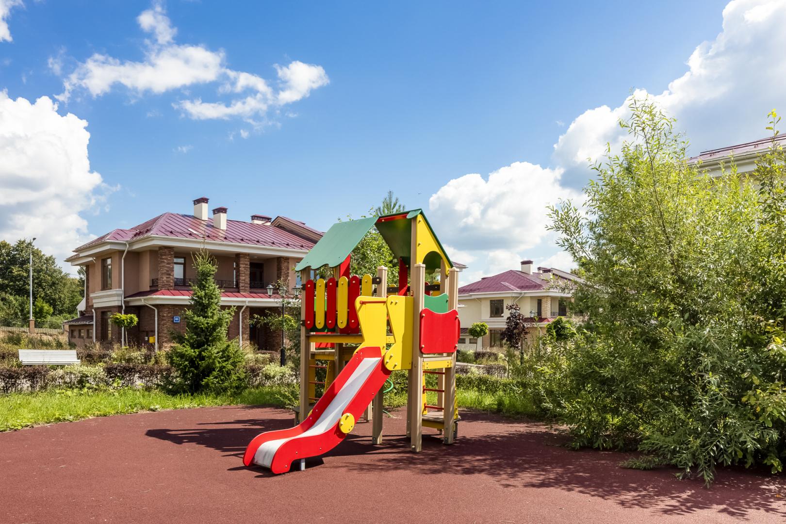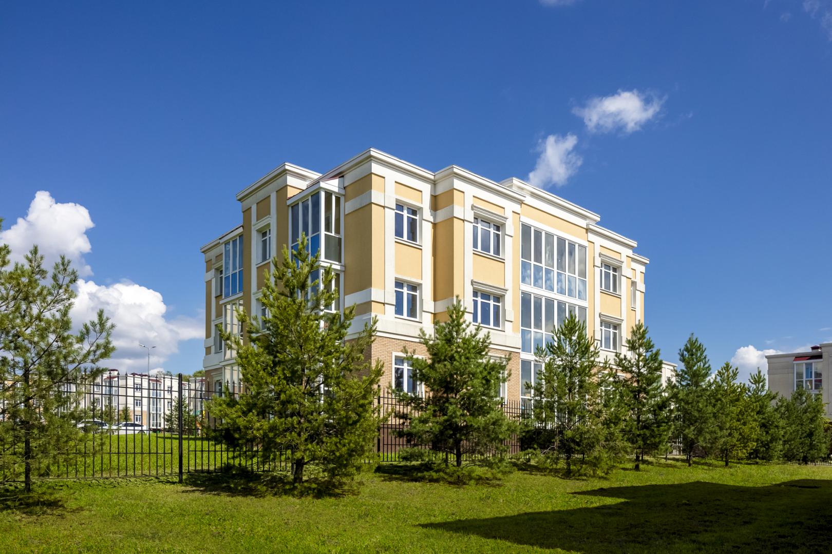 Территория комплекса полностью благоустроена — организованы детские и спортивные площадки, высажены деревья, кустарники и газоны, разбиты клумбы.